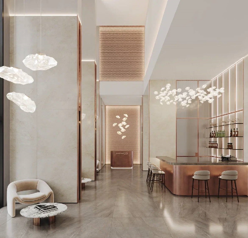 В состав функциональных зон общественных пространств войдут входные группы и зоны ожидания, лобби-бар и гостиная для резидентов. Также для удобства в лобби предусмотрены лапомойки и колясочные комнаты. В отделке применяются высококачественные материалы, а каждая деталь, от декоративных стен и световых инсталляций до фурнитуры и мебели, тщательно подобрана для создания цельного и гармоничного образа. В пространствах появятся элементы современного искусства и дизайнерская мебель, которые подчеркивают индивидуальность проекта и его статус.